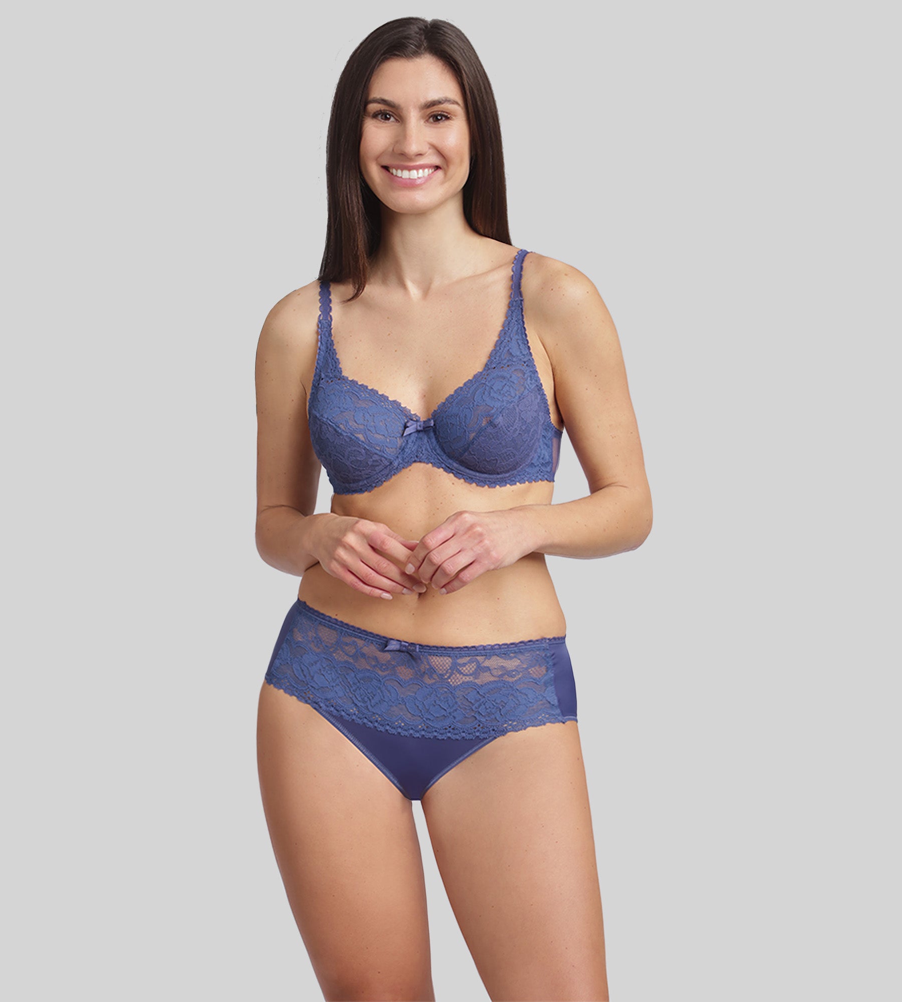 Descubra las braguitas midi Flower Elegance Reciclado azul cobalto, un modelo que combina romanticismo, comodidad y elegancia para el día a día. Su color profundo y luminoso evoca serenidad y modernidad, aportando un toque de frescura a su cajón de la ropa interior. Su suave microfibra se adapta delicadamente a las formas, mientras que su cintura de encaje floral realza la cintura y resalta la feminidad. Su cobertura óptima y su fondo forrado de algodón garantizan un bienestar duradero. Los detalles satinados y el refinado encaje completan este delicado diseño, para un resultado tan cómodo como seductor.