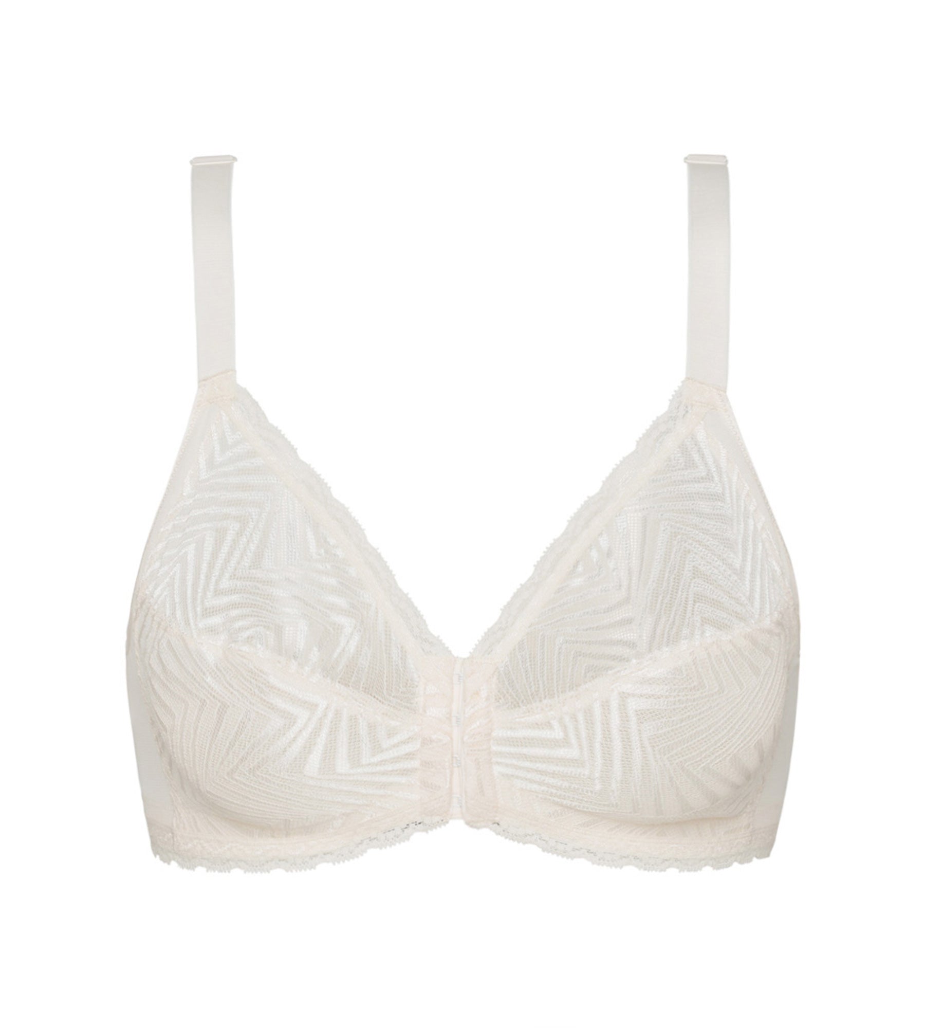 Este sujetador con apertura delantera ofrecerá una comodidad y una sujeción perfectas a tu pecho. Su construcción cruzada en la espalda en tejido Powernet tiene el poder de tirar de los hombros hacia atrás y por lo tanto favorece una mejor postura. Esta tecnología también ayuda a reducir el dolor de espalda. Con su encaje gráfico, este sujetador es muy elegante y femenino. Sujetador con apertura delantera de color marfil que quedará invisible bajo toda tu ropa. Para el verano o el invierno será el compañero perfecto.