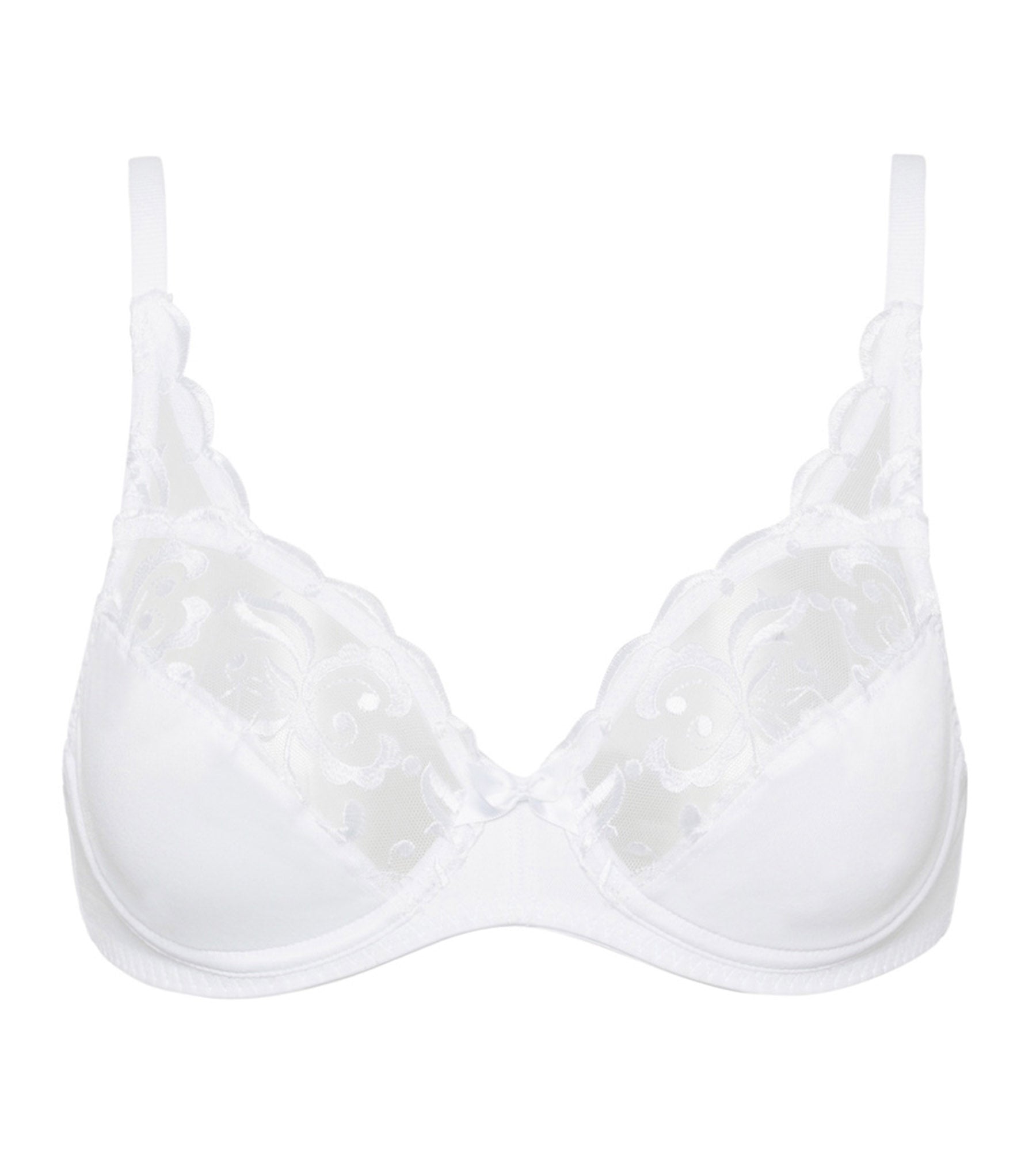 Descubre la novedad Playtex® de esta temporada: un sujetador con aros adornados con un delicado bordado en la parte superior de las copas. Encuentra la alianza del confort y de la elegancia en este sujetador blanco Essential Elegance Bordado. Su construcción te asegurará una sujeción y un confort óptimos para tu pecho. Sus detalles de bordado y el nudo de satén en la parte delantera hacen que esta pieza de lencería sea sofisticada y femenina. Es perfecta para llevar cada día y para todas las siluetas. Para los pechos más generosos, podrás fortalecer la sujeción gracias a sus amplio tirantes.