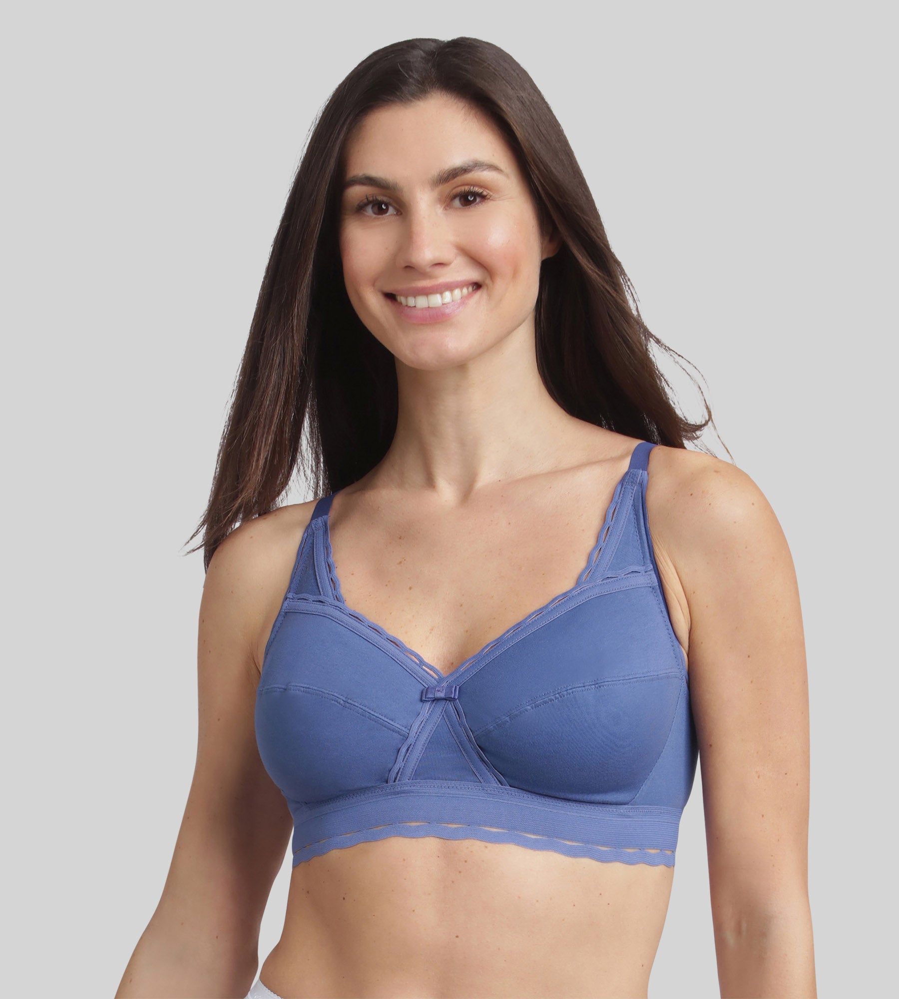El sujetador sin aros Cruzado Mágico Algodón Bio se viste esta temporada con un nuevo color azul cobalto, intenso y refinado. Su emblemática estructura en cruz, resaltada por un elástico festoneado, separa delicadamente el pecho y garantiza una sujeción perfecta, cómoda y natural. Las copas cubiertas, totalmente forradas de algodón, garantizan una sensación de bienestar durante todo el día. Los tirantes anchos de tul, que prolongan las copas, realzan el escote, mientras que la espalda ancha en U con dos alturas de cierre ofrece una sujeción óptima. Su suave y amplio borde festoneado combina elegancia, sujeción y comodidad.