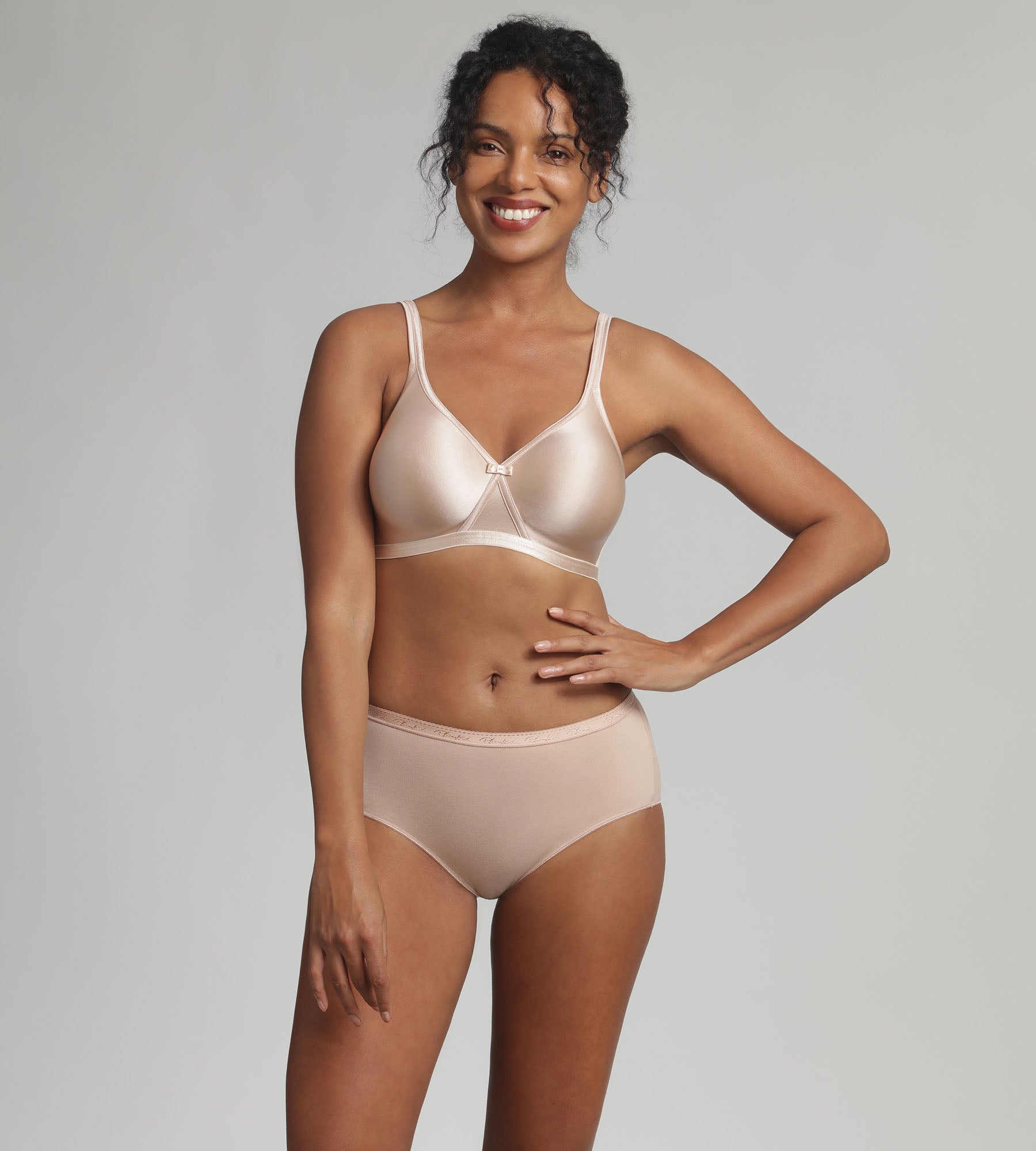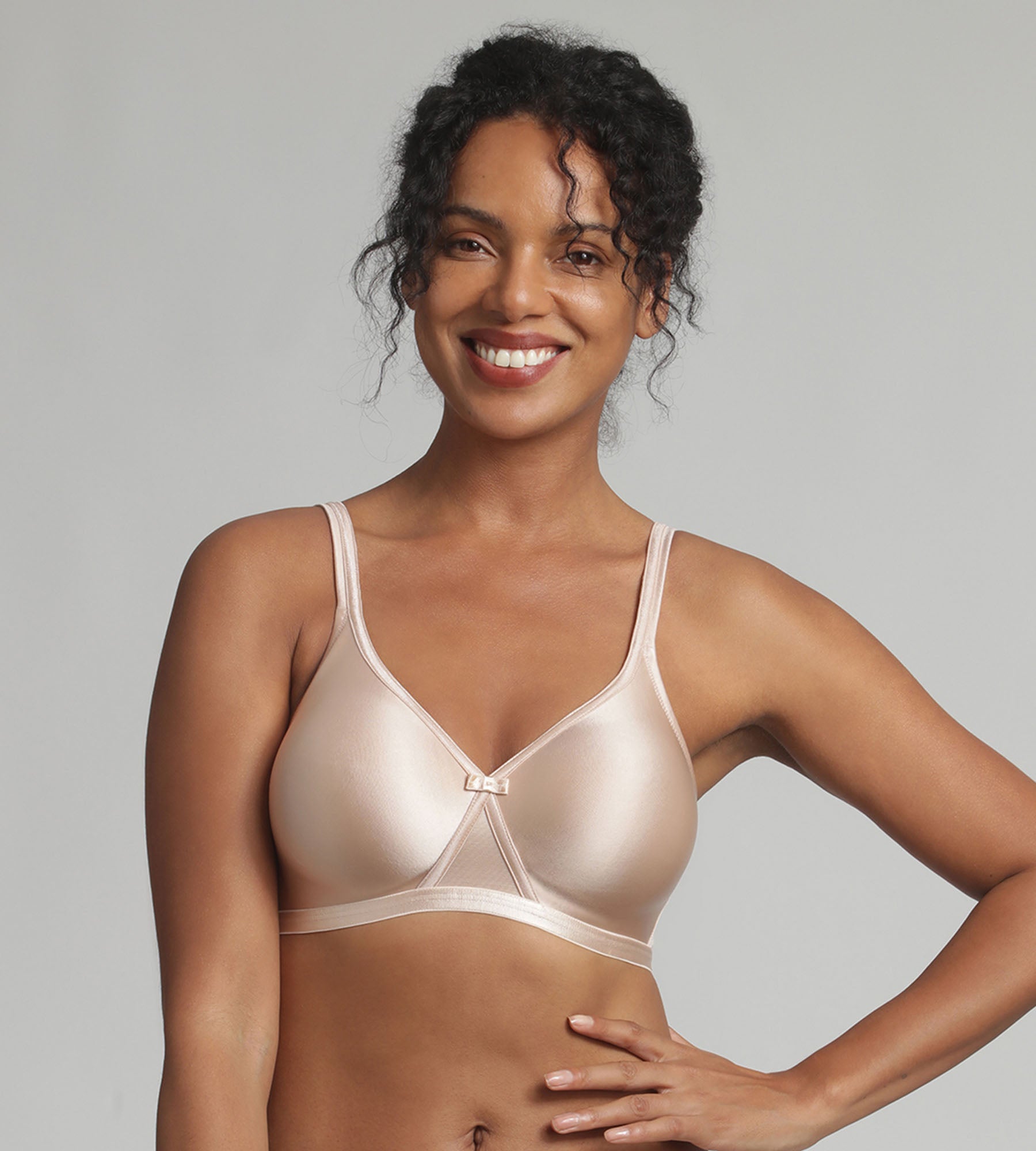 Suave y sedoso, el sujetador sin aros de la colección Satiny Microfiber es lo último en invisibilidad. Es la prenda ideal para llevar con ropa ajustada. Esta lencería femenina combina perfectamente con las bragas de algodón elástico de color piel.