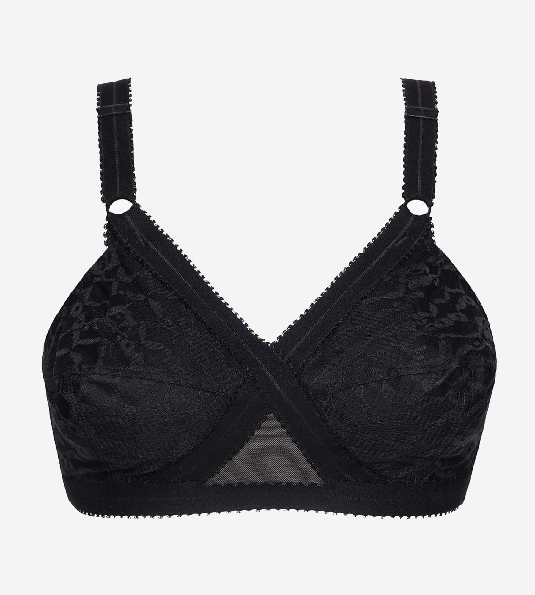 El sujetador negro sin aros de la línea Cruzado Mágico 556 forma parte de las prendas de culto de la casa Playtex®. Su famosa sujeción Cruzado Mágico sin aros proporciona una sujeción realmente impecable. Está reforzado con tirantes y entrecopas anchos, copas envolventes y un material denso recubierto de encaje tono sobre tono. La sujeción es perfecta, el confort total y la feminidad está asegurada.